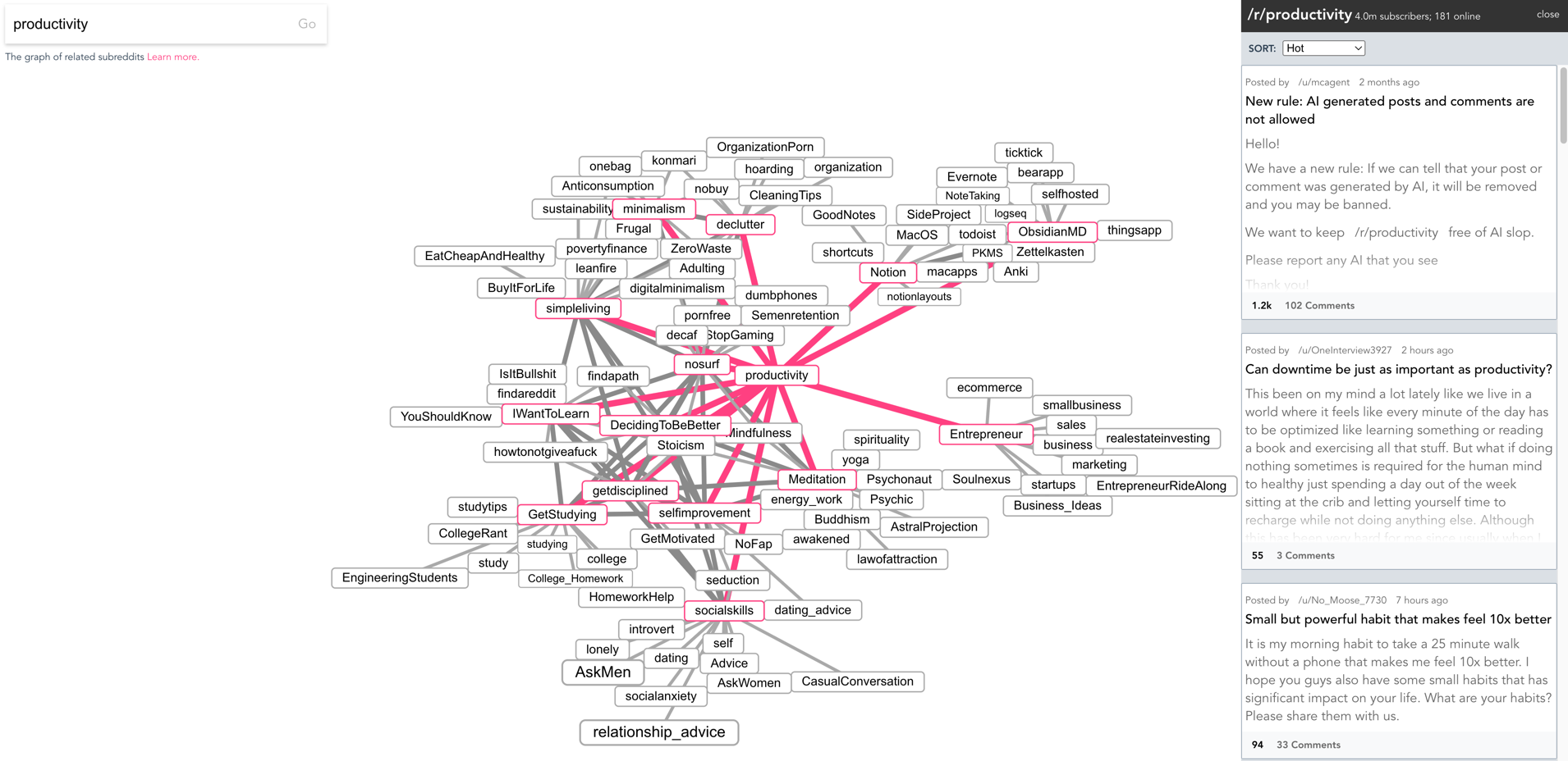 Then keep discovering related ones. You'll find r/GetStudying, r/ADHD, r/WorkFromHome, and dozens more. Make sure you cover all angles of your research.